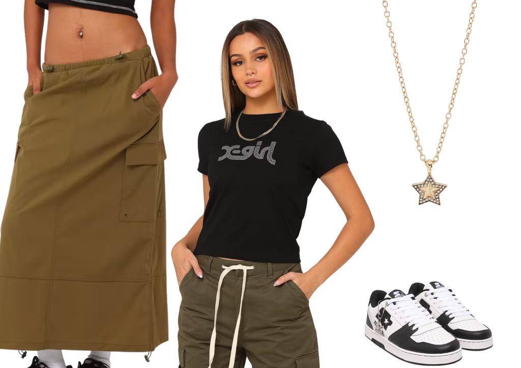 Pair the X-Girl Women's Mills Rhinestone T-Shirt with the Mnml Women's Parachute Maxi Skirt for a chic and sophisticated outfit. This maxi skirt is made from a lightweight and flowy parachute fabric that is perfect for twirling on the dance floor. The high waist and full-length cut make it a flattering choice for any body type.