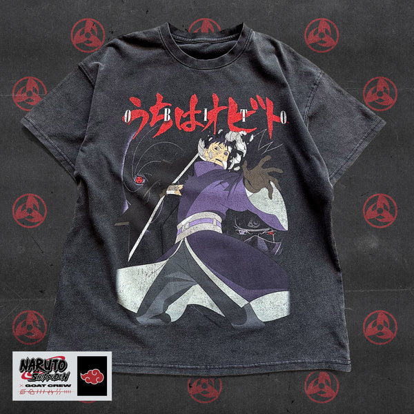 Obio Uchiha aka Tobi, the leader of the Akatsuki known for his iconic mask. Was believed to have died during the Third Shinobi World War, his only surviving legacy being the Sharingan he gave to his teammate, Kakashi who his featured on the back of the tee.